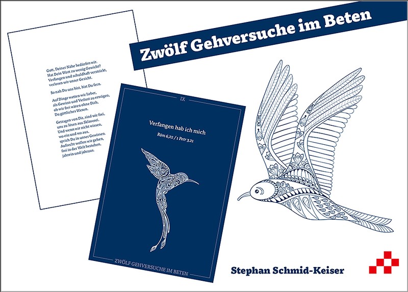 Zwölf blaue Karten im A5-Format, vorne mit feingliedrigen, in weisser Schraffurtechnik phantasievoll gestalteten Vögeln, dem Titel und dem Hinweis auf einen Bibeltext, auf der anderen Seite ein kurzes, manchmal in Versform gehaltenes, immer neu formuliertes und zeitgemässes Gebet: Das sind die «Gehversuche im Beten» des Theologen und langjährigen Seelsorgers Stephan Schmid-Keiser. «Erbarmungsrufe um Frieden», «Wieder fröhlich nach allem» oder «Allen Widrigkeiten zum Trotz» – letzteres auf der Karte mit einer Ruhe verströmenden Eule, die auf einem Schlüssel sitzt – zu jeder inneren Verfassung lässt sich ein Gebet finden, das unser «Suchen und Stammeln vor fern-nahem göttlichen Grund» ausdrückt.