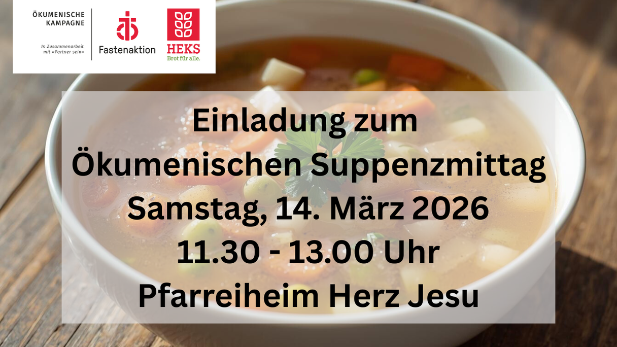 Herzliche Einladung zum Suppenzmittag am 14. März um 11.30 Uhr, im Pfarreiheim Herz Jesu. Wie jedes Jahr erwarten Sie verschiedene Verkaufsstände sowie eine feine Suppe und diverse Wähen und Kuchen. Es gibt verschiedene Angebote der Handarbeitsgruppe «Komme was Wolle». Die Schülerinnen und Schüler reinigen Ihre Velos. Der Erlös ist für das diesjährige Fastenopfer-Projekt, Mit eigener Kraft aus der Abhängigkeit in Indien. Wir freuen uns sehr, wenn Sie eine Wähe oder einen Kuchen beisteuern möchten. Bitte melden Sie sich dazu beim Sekretariat, 052 235 03 70.