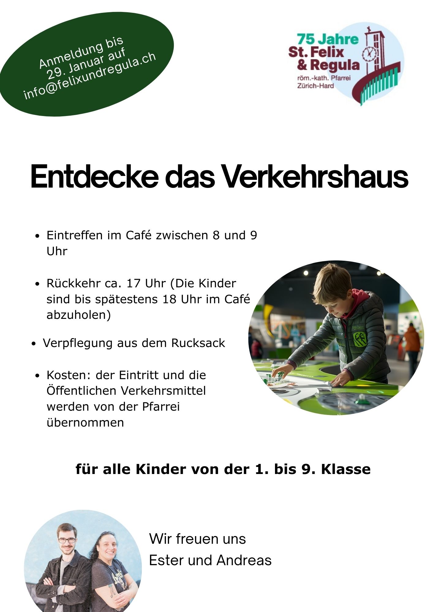 Rückkehr ca. 17.00 Uhr. Die Kinder müssen bis 18.00 Uhr abgeholt werden. Der Ausflug ist kostenlos. ÖV-Ticket und Eintritt werden von der Pfarrei übernommen. Sie können Ihr Kind bis zum 26. Januar auf unserem Sekretariat anmelden: info@felixundregula.ch. Die Verpflegung muss von zu Hause mitgenommen werden.